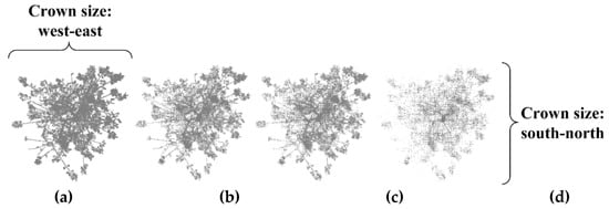 Finally, it is expected that the larger reconstruction errors will reduce estimation accuracy. As the compression ratio increases, more point clouds deviate from their original positions. If a point far from its original position happens to be retained by statistical filtering, there will be a slight increase of morphological attributes as indicated by the crown size and tree height of Poplar 3 with shrubs when compression ratio is 80%. On the other hand, when reconstruction causes overlaps of points and thus some local points may be missing, morphological attributes may be underestimated as indicated by the sudden decline of tree height of Poplar 2 when compression ratio is 60%.