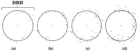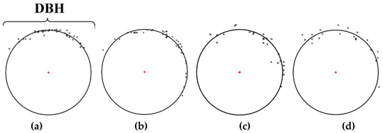 The DBH of Poplar 3 with shrubs with different compression ratios. (a) Compression ratio: 20%, (b) compression ratio: 40%, (c) compression ratio: 60%, (d) compression ratio: 80%.
