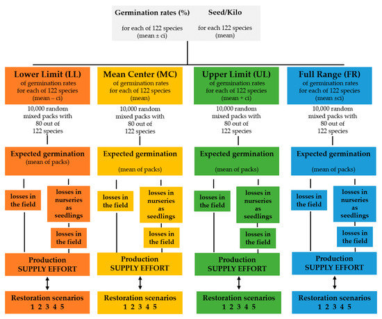 Based on the databases of these six seed networks, from 2007 to 2018, we estimated the total amount of seed (tonnes), the number of seed collectors, the collector productivity (capacity of seed collection kg/collector) and income generated using an unbalanced panel regression. We then extrapolated those indicators to provide the first-ever assessment of the number of seeds and the number of collectors that would be required to meet the Brazilian commitments to restore 12 million hectares. First, we designed five restoration scenarios (Table 1) of different shares of direct seeding, seedling planting and natural regeneration adapted from the National Plan for the Recovery of Native Vegetation (Planaveg) [35]. We assessed ten years of germination database of the Institute of Forestry (Sao Paulo State, Brazil) encompassing 122 native species and 1941 germination tests, we estimated different expected values of germination in mixed-seeds packs randomly combining 80 of the 122 species available, using the Monte Carlo Markov chain (Figure 1). We estimated confidence intervals for germination rates by species and for mixed-seeds packs randomly combining 80 out of the 122 species available, in 40,000 repetitions, to minimize under or overvaluation due to species-specific bias. Survival rates of mixed seeds in the field, losses in nurseries, and seedling deaths up to four years after restoration implementation were considered based on the literature [38,39,40,41] in order to build different baselines on seed production (supply effort). No improvement in native seeds technology, seed production, or supply chain was considered. To estimate the total numbers of native seeds, collectors and amount of income, the coefficients provided by the unbalanced panel regression model were used to achieve each restorations scenario. Detailed statistical methods are described in Supplementary Materials B. We also elaborated key strategies for upscaling seed sources through the identification of ways the empirical evidence of the seed networks can assist to overcome the current shortage of plant material. The strategies were designed to inform a set of essential actions that must be taken by multiple stakeholders to implement FLR and achieve diverse goals.