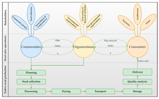 The current availability of plant material sources is considered insufficient [19,20] for meeting the global demand for hundreds of thousands of tonnes of native seed for large-scale restoration goals [18]. In tropical regions, the use of highly diverse native species in FLR is severely limited by a lack of seed biology knowledge [21], the poor performance of the restoration market [22], a low level of incorporation of local knowledge [18], power centralized on governments [23,24,25] and the necessity to develop applied technologies [26,27]. Over recent decades, a wide range of seed programs has emerged in the tropics to overcome native seed scarcity [28] linked with local communities who own the biodiversity knowledge and traditionally collect and exchange plant materials [19]. Initiatives and organizations have engaged in seed production to connect stakeholders and exchange knowledge and technologies at different levels [29]. Key stakeholders include businesses, investors, governments, researchers, universities, non-governmental organizations (NGOs), and local communities [30]. Community networks have linked a diverse group of collectors who have harvested, processed, and stored seeds with restoration consumers who need seed for mandatory compliance [31,32].