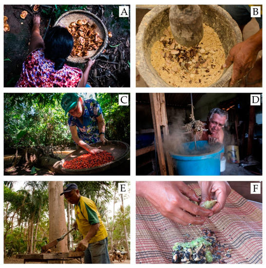 Diverse materials and techniques applied for native seed processing by collectors according to local knowledge and experiences in different Indigenous and rural communities in the Upper Xingu region, covering use of natural fiber basket for seed collection and processing (A,C); adaptation of pestle (B) and Indigenous matting (F) for seed processing; development of machine (D) and tool (E) for seed extraction. Source: Tui Anandi/ISA.