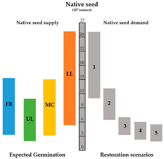 Native seed sources required to restore 12 million hectares in Brazil. Grey bars represent the restoration scenarios (Table 1), and colored bars represent the range of the seed supply effort, covering the possibilities of Lower Limit Production (LL), Mean Center Production (MC), Upper Limit Production (UL), Full Range Production (FR).