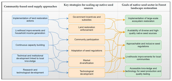 Scaling up native seed sources requires a multi-scalar negotiation of multiple stakeholders to effectively enforce and implement processes to develop national strategies and actions for FLR. The method of structuring seed programs demonstrates the importance of incorporation of local participation and knowledge for effective operations and outcomes. Community-based native seed production advanced supply systems with significant social benefits that integrate ecosystem restoration, market, and policies. We identified the importance of seed production for promoting local opportunities for local communities to improve local livelihoods and access income. Although Planaveg mentioned the importance of land restoration for generating income, increasing jobs, empowering communities [35], there is a lack of information and political strategies of how these can be effectively applied. Native seed and seedling supply is a tangible way to a win-win approach for promoting local opportunities for well-being improvements and support the execution of large-scale restoration actions.