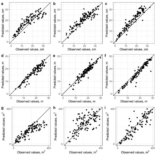 Observed versus predicted values: top row indicates D, middle - H and bottom - GSV. Plots are arranged according tree species: (a,d,g—Silver birch; b,e,h—Black alder; c,f,i—Common aspen). Red line illustrates 1:1 agreement between values.