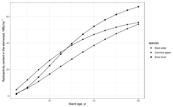 Typically, considering higher TF and growth rate, Silver birch stands accumulate the largest stocks across their life (Figure 2). Black alder stands can reach higher stocks up to a 25-year-old threshold. Differences between 90Sr stock related to various site indexes at the same (60 yr) age and soil (40 kBq·m−2) contamination level are visualized in Figure 3.