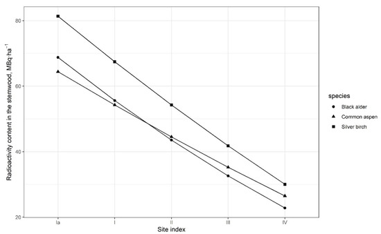 Dependence of the 90Sr activity stock in stemwood (at 40 kBq·m−2 in soil and stands age 60 years) on various site index of forest stands.