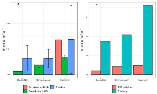 Comparison of transfer factors (TF) of 90Sr from soil to the stemwood of studied tree species (a—arithmetical means, b—geometrical means). Error bars show arithmetical standard deviations (SD) of TFs.