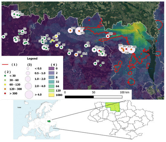 Radioactive contamination of forests remains one of the main ecological consequences of the Chernobyl and Fukushima Daiichi nuclear power plant (NPP) accidents [1]. Currently, only long-lived radionuclides (90Sr, 137Cs, and also transuranium elements) pose a radiological hazard in Ukraine [2]. In total, 137Cs deposition exceeded 37 kBq m−2 at the forest area of approximately 1230.7 thousand ha (38.6% total forest land of Ukrainian Polissya as of 1993) [3]. Spatially distributed high-resolution data on levels of radioactive contamination 90Sr in forest are absent currently in Ukraine.