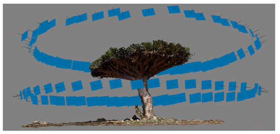 3D tree point clouds were created using terrestrial photogrammetry [36]. The set of overlapping photographs was taken around the tree at different distances and vertical angles (about 150–250 photos for one tree point cloud, depending on the size of the tree). A set of photos was captured to obtain all parts of the tree in perspective. Based on the tree’s accessibility and the steepness of the surrounding terrain, two methods were tested and used. Method (a) created an outer circle of photos to cover the whole tree habitus and an inner circle to capture the structure of the tree crown in detail (see Figure 1). Method (b) used a telescopic camera stick to create two circles of photos with similar diameter and different heights and vertical angles (see Figure 2).