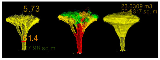Metrics of growth habit were determined using the 3D Forest software version 0.5 (The Silva Tarouca Research Institute for Landscape and Ornamental Gardening–RILOG, Brno, Czech Republic). The first step was a segmentation of the point cloud into individual trees (tree clouds), which was performed automatically by the previously described algorithm [37]. The following eight metrics were evaluated: