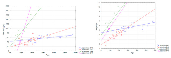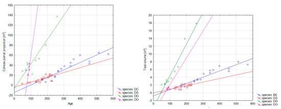 All derived tree metrics were statistically evaluated using Statistica software version 13 (TIBCO Softvare Inc., Palo Alto, CA, USA). The relationship between age and selected metrics was modeled using linear regression. In addition, several nonlinear models were tested; nevertheless, any significant improvement in the quality of the model was found. Mean value differences of metrics among individual species were analyzed using one factor analysis of variance (ANOVA). Tukey’s test was used as a multiple comparisons test. Comparison of confidence intervals of the metric’s mean values is presented in Figure S1. All tests were performed on the significance level α = 0.05.