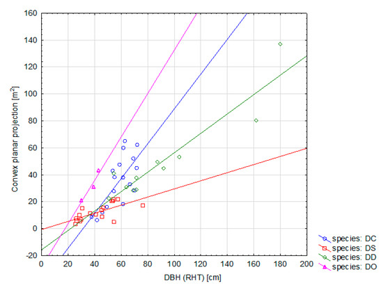 Convex planar projection compared to the stem diameter at breast height (DBH). Key: DC—Dracaena cinnabari; DS—D. serrulata; DD—D. draco; DO—D. ombet.