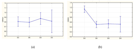 (a) Canopy volume coefficient (CVC) computed as the ratio of canopy planar projection to canopy volume (CPP/CV). (b) Canopy height coefficient (CHC) computed as the ratio of canopy depth to canopy height (CD/CH). Key: DC—Dracaena cinnabari; DS—D. serrulata; DD—D. draco; DO—D. ombet.