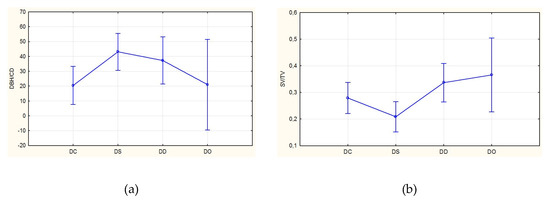 (a) Stem volume coefficient (SVC) computed as the ratio of stem volume to total volume (SV/TV). (b) Stem diameter coefficient (SDC) computed as the ratio of diameter at breast height to canopy depth (DBH/CD). Key: DC—Dracaena cinnabari; DS—D. serrulata; DD—D. draco; DO—D. ombet.