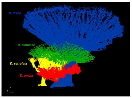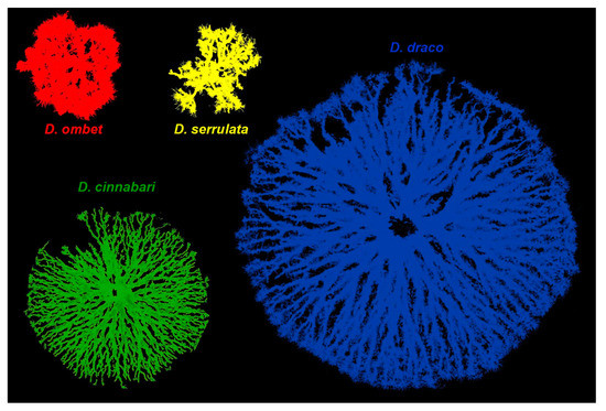 Additionally, the parameters of convex planar projection and the total volume have multiple higher values in the case of D. draco when compared with those of other species. Canopy growth and the total volume of D. serrulata show a downward tendency compared to those of D. cinnabari (see Figure 6).