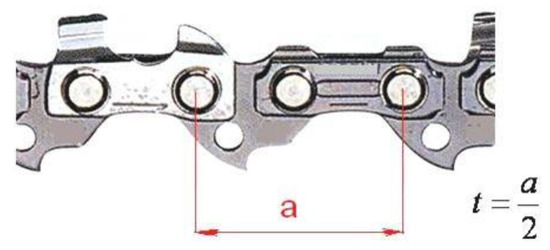 Method of determining saw chain pitch. a: distance between axes everythree rivets; t: saw chain pitch (half the distance between axes every three rivets).
