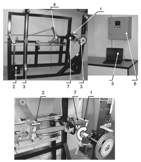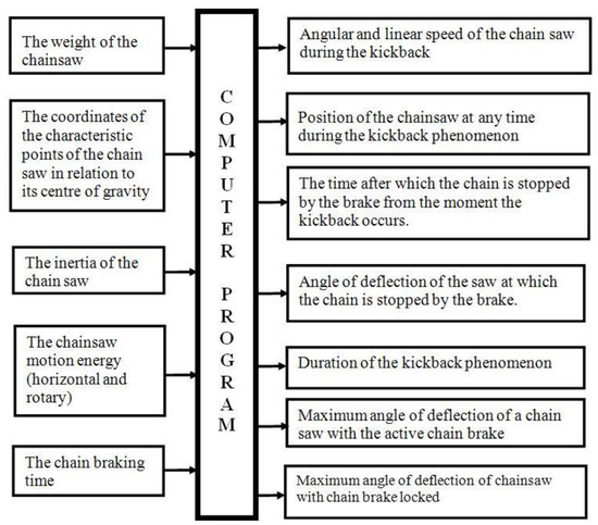 The research used mainly test stands for saw chain kickback and braking in accordance with standards [13,27], as well as other stands designed and built at the Central Institute for Labour Protection—National Research Institute (CIOP-PIB) for testing in accordance with normative requirements [16,17,28]. A computer program was used to simulate chain saw motion and calculate kickback angle (Figure 2).