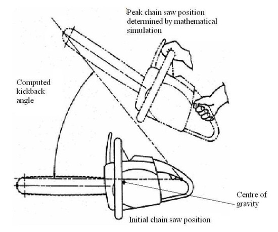 Computer simulation of chainsaw motion and calculation of kickback angle.