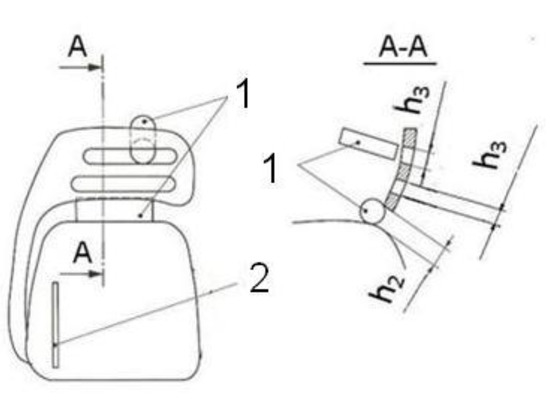 The chain catcher (Figure 15) is located in the lower front part of the chainsaw body and is intended to stop a saw chain that has fallen or has become derailed from the guide bar. According to the standards [32], the catcher must have adequate resistance to saw chain impact. During a single impact on the catcher with an energy of 7.5 ± 0.3 J, neither the catcher nor its mounting should be fractured or cracked or otherwise damaged. It may only bend during this test.
