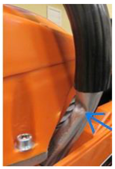 This component should be positioned as far from the face of the chainsaw body as possible and should protrude from the body wall so that its face is at least 5 mm from the plane of symmetry of the guide bar. CIOP-PIB tests showed that not all chain catchers meet the requirements of the standards. Negative results for this test were obtained when these components were made of plastic and, in accordance with the standards, the impact tests were carried out at a reduced temperature of 25 °C. Improper mounting of these components to the chainsaw body, as well as poor quality material, caused the chain catchers to break off during this test (Figure 16).