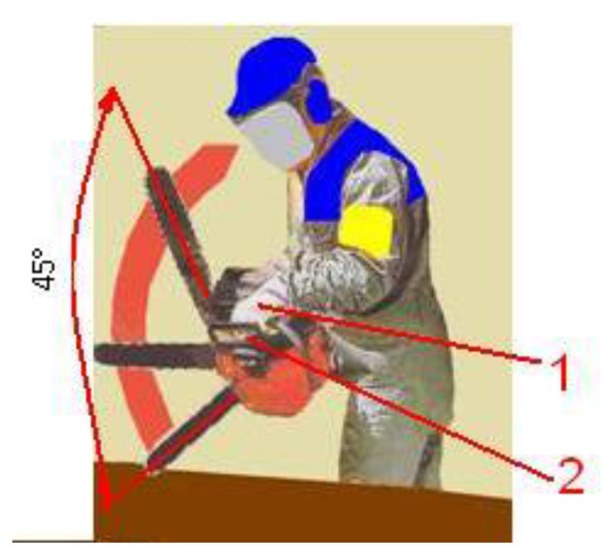Sample position of a chainsaw operator during tree harvesting. 1: operator’s hand holding the front handle of the chainsaw in a position which prevents movement of the front guard (brake activation).