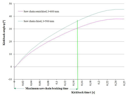 The research results presented here show that the risk of injury caused by the use of chainsaws (in particular due to the occurrence of kickback) is influenced not only by the design features of the machines (depending on the decisions taken by their manufacturers) but also by their proper use. A chainsaw that has a required kickback angle of 45° due to inappropriate selection of equipment (e.g., guide bar, saw) or improper handling (e.g., incorrect sharpening, wrong selection, too low voltage) can achieve a kickback angle much higher than this value.