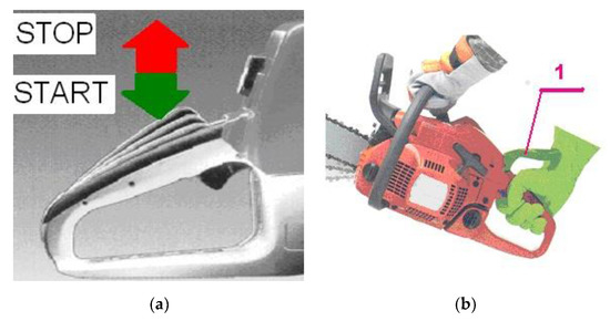 The control elements of the chainsaw should be designed and arranged in such a way as to enable operators to control the machine without causing injury to themselves from accidental movement of the saw chain or from starting the chainsaw. A recurring design error with some chainsaws was the possibility of locking the throttle trigger in a position where the saw chain was moving along the guide bar. This was possible with the use of the throttle lock control element (Figure 12a). In accordance with the normative requirements, the throttle trigger, when released, should automatically return to the idle position, where the saw chain is still and there is no risk of injury (due to contact with the moving saw chain). The possibility of accidental saw chain movement should be minimized by means of appropriate connections of the throttle trigger mechanism to ensure that the force applied to the rear handle, when the throttle lock is engaged, does not increase the engine speed (resulting in clutch engagement and saw chain movement start).