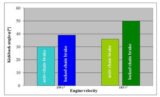 Tests of the manually operated (in different ways) chain brake showed that it met the requirements for maximum activation time and ergonomics. However, regardless of the technical solutions that may be applied to a chainsaw, it is extremely important for the operator to check all available means of activating the brake before using the machine in order to ensure his/her safety. Tests of chainsaws have shown that a functional brake activated by manually shifting the front guard significantly reduces the kickback angle (Figure 13).