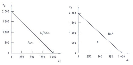 Threshold acceleration levels at the guide bar tip for activation of inertia-triggered chain brake on chainsaws for forestry service with engine capacity of > 40 cm3. ax, horizontal acceleration (m/s2); ay, vertical acceleration (m/s2); Acc., acceptable acceleration; N/A, non-acceptable acceleration.