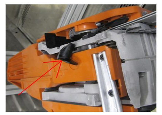 The phenomenon of kickback [14] can occur only when the cutting link (at the tip of the guide bar) comes into contact with the wood and the saw chain is braked violently. Protection against chainsaw kickback is a complex technical problem. To provide this protection, a number of normative requirements [17] must be met for chain brake performance and kickback angle limitation. The research on this matter is also complex [14] because, apart from the kickback test stand, other test stands are used, e.g., for testing the moment of inertia of chainsaws [1] or saw chain braking time [27]. Tests of the stopping time of the saw chain, activated by displacement of the front guard (brake lever), showed that the stopping mechanism was working properly and that the average and maximum stopping time of the saw chain did not exceed the permitted normative values of 0.12 and 0.15 s, respectively. In the event of kickback, braking of the saw chain occurs somewhat ‘automatically’ because turning the chainsaw towards the operator causes the hand (on the front handle) to come into contact with the front guard and move the front guard forward (Figure 8).