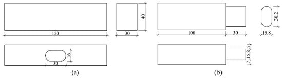 All specimens used in this study were processed using a computer numerical control (CNC) machine with an accuracy of 0.01 mm (WPC, Shanghai, China). T-shaped M&T joint specimens used to measure withdrawal resistance by the tensile method were composed of mortise member and tenon member. The mortise was drilled in mortise member, and tenon was machined in tenon member. Figure 1 shows the dimensions of mortise member and tenon members of T-shaped specimens. The dimensions of mortise member are 150 mm (length) × 40 mm (width) × 30 mm (thickness) with a mortise measured as 30 mm (depth) × 30 mm (height) × 16 mm (width). For tenon member, the dimensions are 100 mm (length) × 40 mm (width) × 30 mm (thickness) with a tenon measured as 30 mm (length) × 30.2 mm (height) × 15.8 mm (thickness). The tenon fit between mortise and tenon was chosen according to processing technology of a real M&T joint, i.e., the mortise width and tenon thickness are 0.2 mm clearance fit, and the mortise height and tenon width are 0.2 mm interference fit. The specimens used in the compressive method composited of a mortise member and a tenon. The dimensions of mortise member and tenon are as the same as those of specimens used in the tensile method. All samples were conditioned in a humidity chamber controlled at 20 ± 2 ℃ and 50% ± 5% relative humidity (RH) for two weeks.