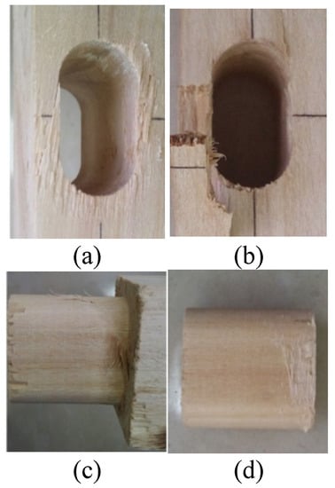 The unglued M&T joints did not show obvious damage when withdrawal resistances of joints reached their maximum loads. Figure 3 shows the typical failure modes of the tested glued M&T joint. In the case of withdrawal resistances of M&T joints measured using tensile method, fibers of mortise and tenon were all torn. In addition, the end of the mortise facing the shoulder of the tenon was glued with the shoulder of the tenon by the glue overflown, to some extent, which increased the withdrawal resistance of the M&T joint [,]. This was one of the reasons why the withdrawal resistance of the M&T joint measured by the tensile method was higher than that measured by the compressive method. However, in the case of withdrawal resistance of the M&T joint measured by the compressive method, the end of the mortise was split, but the tenon was not damaged.
