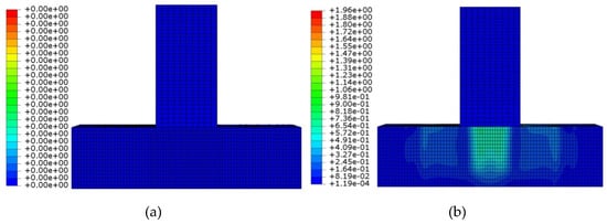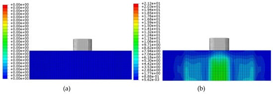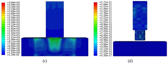 Figure 5 suggests stress distributions of M&T joint in different stages during the compressive test based on FEM. Figure 5a shows the initial state that the load was not applied, so the stress of the specimen was zero. Figure 5b shows the loading state. Figure 5c shows the stress distributions of the T- shaped M&T joint that was just pulled out, when load reached the maximum value. Finally, the tenon that was completely pulled out is shown in Figure 5d.