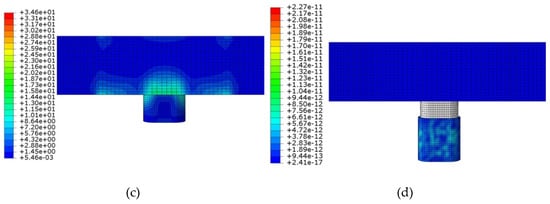 Figure 4 shows the stress distributions of the T-shaped M&T joint in different stages during the tensile test based on FEM. Figure 4a was the initial state in which the load was not applied. Figure 4b shows the state before the tenon was pulled out. Figure 4c shows the stress distributions of the T-shaped M&T joint that was just pulled out with the load reaching the maximum value. Finally, the tenon that was completely pulled out is shown in Figure 4d.