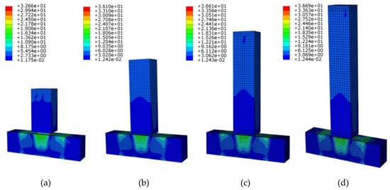 Comparing Figure 4c and Figure 5c, the M&T joints all reached their maximum loads when measured by tensile and compressive method respectively. However, the stress distributions of the joint shown in Figure 4c was higher than those shown in Figure 5c, which is consistent with the experimental results that the withdrawal resistance of the M&T joint measured using the tensile method was higher than that measured by the compressive method. How did this phenomenon come to be? In the experimental section, the effect of the tenon shoulder can explain this phenomenon partly, but in the numerical section, the effect of the shoulder was not considered in the finite element model. Another factor must influence the withdrawal resistance of the M&T joint. Comparing the two testing methods, the main difference was the sample; specifically, the length of tenon member. For the sample used in the compressive method, the length of the tenon member can be regarded as zero. However, for the T-shaped sample used in the tensile method, the lengths of tenon members were different in previous studies [,,].