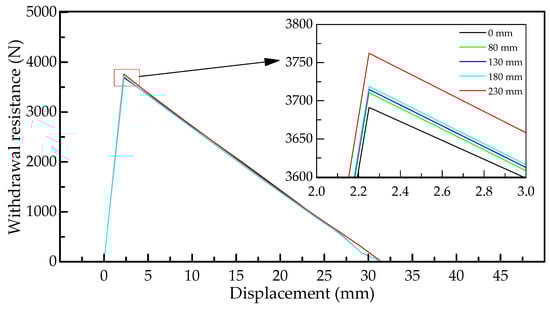 In order to get a comprehensive comparison, withdrawal resistance and displacement curves of all samples were obtained by the post-processing function of ABAQUS. Figure 7 shows the withdrawal resistance and load curves of five types of samples including one compressive sample and four T-shaped tensile samples. From the whole view, the withdrawal resistances of all samples were nearly the same. However, from a local perspective, the withdrawal resistances increased in line with the increase of tenon member length. In other words, the withdrawal resistance measured by the compressive method was lower than that measured by the tensile method. For furniture structure design, researchers and engineers should choose an appropriate method according to the real situations.