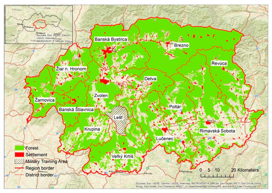 Slovakia is still considered a rural country where almost half of the population (45%) still lives in villages (2752 in total, 95% of all Slovak settlements). The Banskobystrický Self-governing Region (SK032 NUTS 3) is the largest region of eight designated self-governing regions in Slovakia, and it is situated in the South-Central part of the country (Figure 1). Lešť Military Training Area was excluded from the analysis due to its restricted access. The study area lies in a temperate climate zone, but its natural conditions are strongly influenced by its rich geological development resulting in landscape types such as basins and mountain ranges, including various microrelief forms, with altitudes raising from 120 up to 2050 m above sea level. The region is covered with almost a full spectrum of forest stands occurring in Slovakia, starting from floodplain forests, sub-mountain floodplain forests, oak forests, lime-maple forests, beech forests to spruce forest at the highest altitudes.