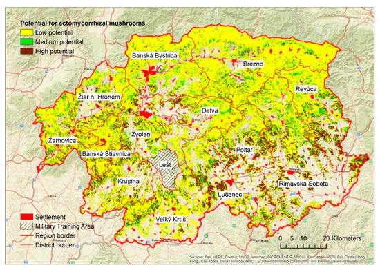 The method applied for assessing the potential for ectomycorrhizal mushrooms in the study area was based on the set of variables on a site’s natural conditions and forest stand’s structure and the available national Forest Inventory database. The main advantage of this database is that it is a mandatory database for all forests in the Slovak Republic serving as the basis for Forest Management Programs; therefore, it is updated every ten years following uniformed structure and quality. This means that the presented method can be rather easily applied for the whole country in case there is a demand for such an analysis. In addition, the applied calculus is rather simple and enables the addition of more variables if needed. Since it is based on multicriteria analysis, it is also compatible with the multicriteria decision analysis method applied in land management studies such as land suitability evaluation [49], land management [50], or flood risk assessment [51]. It is also applied in optimal forest management for competing ecosystem services [52] as mushroom-based ecosystem services represent an important non-timber provisioning service [4,10].