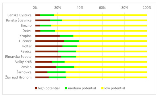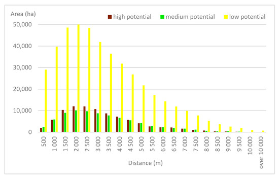 For this reason, the distribution of the potential for mushrooms within 13 districts of the region was analysed (Table 4). As shown in Table 4, the largest areas of forest stands with high potential are situated in the Rimavská Sobota, Lučenec, Revúca, and Poltár districts. It is also true when comparing the relative proportions of high potential forests stands within the districts (Figure 3). Continuing the analysis, a theoretical availability of high potential stands per capita was calculated. In this respect, the most available picking area per mushroomer is in the districts of Poltár and Krupina. However, this accessibility analysis may be biased by districts’ borders’ delineation that, in reality, does not present any limitation for crossing those borders. In order to assess accessibility more realistically, the potential classes’ occurrence was analysed within a distance from settlement zones (Figure 4). This analysis revealed that forest stands with high potential lay at distances from 2000 to 2500 m from the nearest settlement. Theoretically, it is approximately a half to one-hour walk (even less when using transport to the nearest forest border).