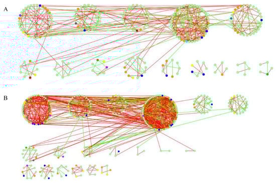 Networks constructed by the RMT-based approach of nifH genes in GeoChip data in HS (A) and JFL (B) forests. Each node indicates a functional gene. Green lines indicate negative interactions between two individual nodes, while red lines indicate positive interactions.