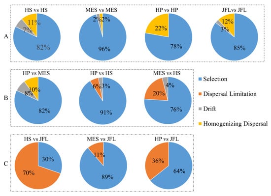 Selection induces differential in survival and reproductive success across individuals and species, and then constrains and differentiates microbial community composition among locations [,]. Selection is caused by biotic pressures like competition, predation, and mutualism among species [], and abiotic pressures like environmental physical and chemical properties []. Selection often has detectable influence over microbial community assembly [,,,]. For example, Stegen et al. [] found that selection governed about 60% of microbial community assembly, which was imposed by an unmeasured environmental variable in deeper sediments in an aquifer of Washington State. Quantitative results from this study further support the idea that selection is dominant in driving microbial community assembly, as selection comprises up to 30–96% of processes.
