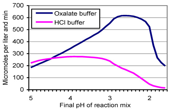 Oxidation of ABTS (µmol L−1 min−1) by culture filtrate of Km 10 in phosphate buffer pH 5, increasingly acidified with oxalate or HCl to result in final pH values of the reaction mixtures down to 1.6 (n = 2).