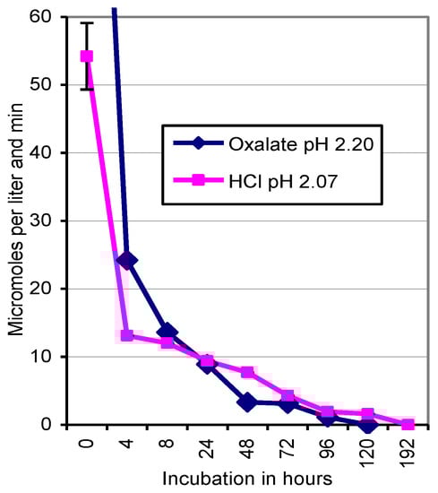 Low pH conditions caused by HCl and oxalate interfered with the persistence and activity of the non-purified laccase as part of the fungal culture fluid. Acidifying a 0.1 M phosphate buffer in the reaction mixture with HCl revealed a maximum of ABTS oxidation at pH 3.8–4.0 (276 ± 14 µmol L−1 min−1) and a drop to 152 ± 7 and 15 ± 2 µmol L−1 min−1 at pH 2.5 and 1.6, respectively (Figure 2). Using oxalate as a source of protons, the conversion rate of ABTS peaked at pH 2.4 (617 ± 54 µmol L−1 min−1) and displayed identical activities of 190 ± 7 µmol L−1 min−1 at pH 5.0 and 1.6. Peaking at pH 2.4 could point to possible interferences with MnP, activated by H2O2 that could have been formed during the decarboxylation of oxalate in the complex mycelial culture fluid (Figure 2). Pre-incubation for 0 to 192 h of the Km 10 culture fluid in phosphate-oxalate and phosphate-HCl buffers acidified to pH 2.20 and 2.07, respectively, reduced the oxidation of the subsequently added ABTS dramatically. The enzyme activities reached zero after incubation for 120 h in the oxalate, and for 192 h in the HCl treatment (Figure 3).