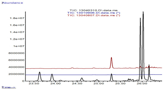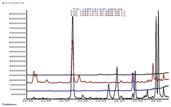 Emission of volatile terpenes by F. pinicola and K. mutabilis in single and in their dual culture during the initial mycelial contact (from above to below; compare Table 3, columns 5; 6; and 8). Main compounds, below: 23.632 (min), alpha-longipinene; 23.918, beta-cubebene; 24.608, gamma-muurolene; 25.295, (±)-gymnomitrene; 25.963, trans-alpha-bisabolene; 26.028, beta-bisabolene; 26.164, delta-cadinene. Medium line (Km 10, blue): 26.189, beta-sesquiphellandrene. Above (Foma 4, red): 24.387, junipene; 24.887, germacrene B; 25.293, (±)-gymnomitrene; 25.964, alpha-muurolene; 26.099, gamma-cadinene; 26.160, delta-cadinene; 26.284, alpha-cadinene.