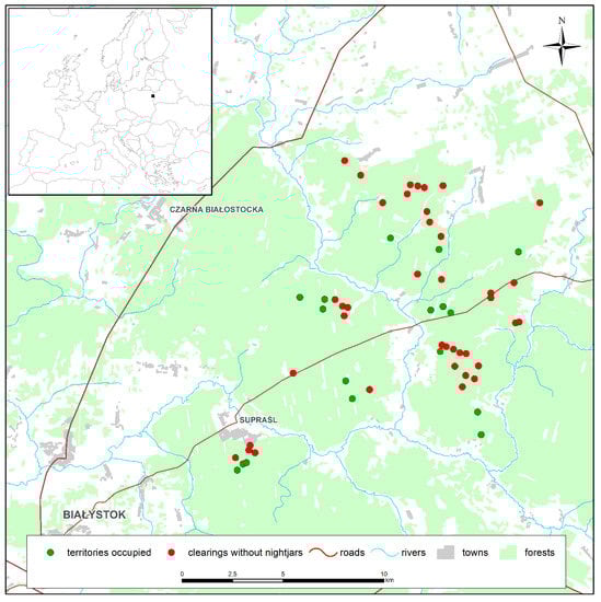 The study area was situated in the Knyszyn Forest (114 km2; NE Poland) which is characterized by a high degree of naturalness and in part is protected as a natural reserve []. This forest is also protected as an important breeding area for many bird species, including the Nightjar [,]. In the woodlands of Knyszyn Forest, the dominant stands are formed by the Scots pine Pinus sylvestris alone (71%) and mixed forests of Scots pine and Norway spruce Picea abies (11%) []. The average age of the tree stands is 57 years, and the dominant age ranges are 50–60 and 80–90 years. A large part of the natural forest communities in the Knyszyn Forest have been commercially replaced by planted stands, which has simplified the woodland structure, and intensive salvage cutting of spruce trees is commonplace []. The clearance of old forest stands is a serious threat to refuges [].