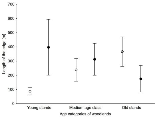 Mean values (points) and 95% confidence limits (whiskers) of edge lengths of tree stands in three age categories bordering unoccupied clearings (open circles) and Nightjar territories (black circles).
