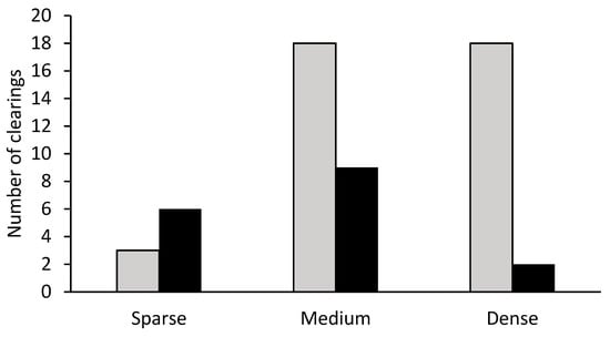 Number of unoccupied clearings (grey columns) and Nightjar territories (black columns) in three categories of undergrowth vegetation.