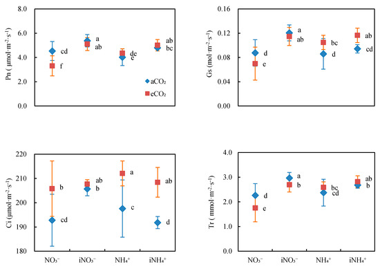 Gas exchange parameters of Phoebe bournei seedlings grown under ambient (aCO2) or elevated CO2 (eCO2) concentrations and that received moderate (NO3−) or high (iNO3−) applications of nitrate or moderate (NH4+) or high (iNH4+) applications of ammonium. Pn, net photosynthetic rate; Gs, stomatal conductance; Ci, intercellular CO2 concentration; Tr, transpiration rate. Data points represent means ± standard deviation (SD); n = 9. Different lowercase letters represent significant differences between treatments (p < 0.05) according to Tukey’s test.