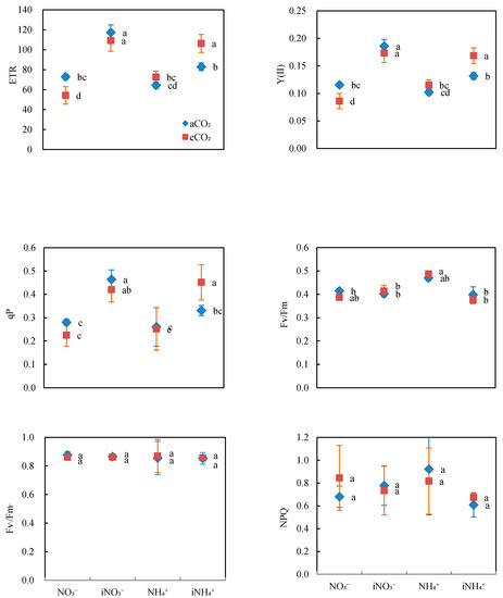 Fluorescence of Phoebe bournei seedlings grown under ambient (aCO2) or elevated CO2 (eCO2) concentrations and that received moderate (NO3−) or high (iNO3−) applications of nitrate or moderate (NH4+) or high (iNH4+) applications of ammonium. ETR, electron transport rate; Y(II), actual photochemical efficiency; qP, photochemical quenching; Fv/Fm, maximum quantum efficiency of photosystem II; Fv′/Fm′, effective photochemical efficiency of photosystem II; NPQ, non-photochemical quenching. Data points represent means ± SD; n = 5. Data points with the same lowercase letter are not significantly different (p > 0.05) according to Tukey’s test.