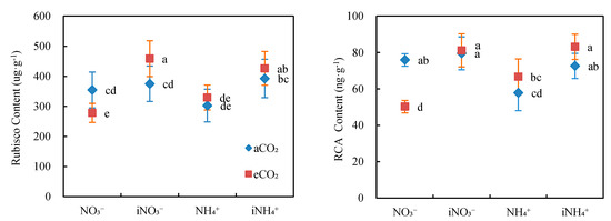 Rubisco and rubisco activase (RCA) content of Phoebe bournei seedlings grown under ambient (aCO2) or elevated CO2 (eCO2) concentrations and that received moderate (NO3−) or high (iNO3−) applications of nitrate or moderate (NH4+) or high (iNH4+) applications of ammonium. Data points represent means ± SE; n = 5. Different letters beside data points represent significant differences between treatments (p < 0.05) according to Tukey’s test.